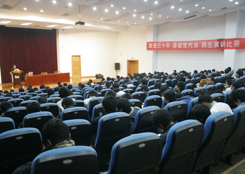 演讲赛上,选手们以他们青春的热情和敏感的心灵颂扬了改革开放三十年来祖国发展和人民生活的变化,表达了他们对中国特色社会主义道路的坚定信念。激情四射的演讲,不时迎来台下观众的阵阵掌声,历时三个小时的比赛,气氛热烈,高潮迭起,充分展示了我校师生奋发向上的精神风貌。