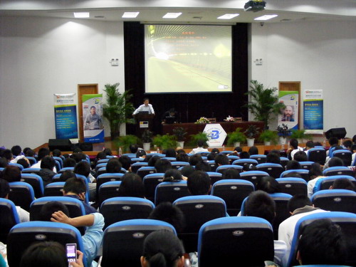 杨捷阐述了“领先、科技、服务”的创业理念,并和同学们分享了自己的创业历程。结合自身感悟,他告诫同学们要用正确的态度去面对生存、支持、友谊、名誉和挫折。他还指出,理想与现实总是存在差距的,而这种差距需要用时间来拉近,有志于创业的同学们必须要有坚定的信念。