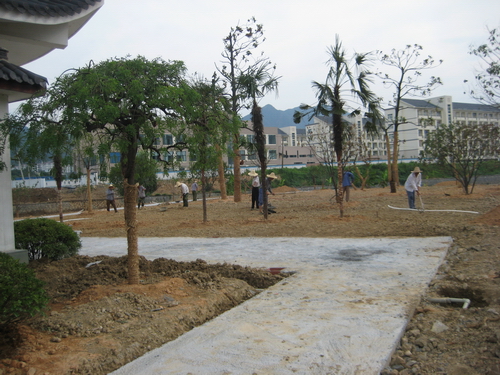 图1:后勤员工正在美化和兴居茶楼周边环境