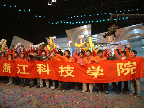 12月26日下午,浙江电视台演播大厅气氛热烈,欢声雷动,央视“LG移动电话—金苹果”栏目正在这里拍摄浙江科技学院专场,我校300多名学生参加了节目录制。选手们机智敏锐的应答,赢得了观众的阵阵掌声和助威声。才艺表演,精彩纷呈,博得喝彩连连。经过“足智多谋”、“狭路相逢”两轮激烈的竞争,计算机系沈月飞同学和土木系王刚同学脱颖而出,进入第三轮“勇者无敌”户外竞赛单元角逐。