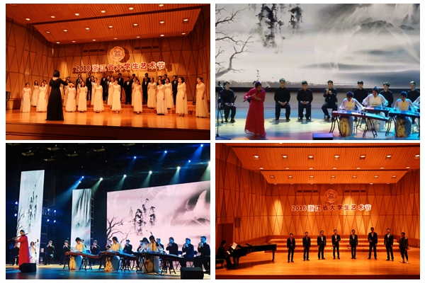浙江省大学生艺术节由浙江省教育厅、浙江省文化厅、浙江省财政厅、共青团浙江省委、浙江广播电视集团共同主办,是我省目前规格最高、规模最大、影响最广的大学生艺术盛会。本次大学生艺术节活动主题为“民族魂·中国梦”,共吸引了来自全省95所高校近4000名师生参加,报送合唱、合奏节目共461个。其中,《大江东去》《城南送别》获得大合唱组一等奖;《三百六十五里路》(指导教师:包卫党、宋雪萍)获得小合唱组一等奖;《花儿红》《阳关三叠》(指导教师:陈静)均获器乐组二等奖。